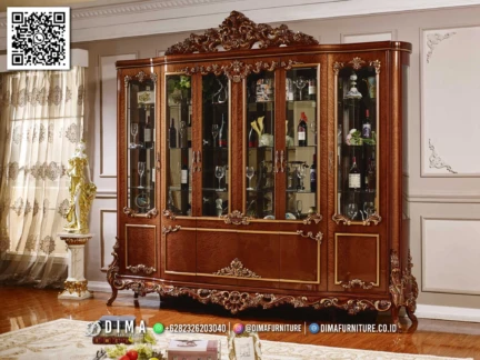 Lemari hias kaca mewah mebel jepara jati grand elite dirancang untuk menghadirkan kesan elegan yang terasa nyata di dalam rumah. Desainnya mengusung gaya klasik mewah dengan detail ukiran khas jepara yang terlihat rapi dan seimbang. Warna alami kayu jati jepara memberi nuansa hangat, cocok untuk ruang tamu besar maupun ruang makan berkonsep klasik.