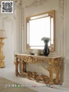 Sebagai bagian dari koleksi meja konsol ukir mewah, produk ini dibuat dari kayu solid pilihan yang kokoh dan stabil. Konstruksinya terasa padat, sesuai dengan konsep well-built furniture yang tidak hanya fokus pada tampilan, tetapi juga kekuatan rangka. Detail ornamen di bagian kaki dan apron mempertegas karakter meja konsol klasik elegan dengan nuansa eropa.