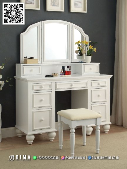 Dengan desain klasik elegan dan nuansa putih yang menenangkan, meja rias dima classic sangat cocok bagi kamu yang ingin menghadirkan suasana kamar yang rapi dan berkelas. Produk ini merupakan hasil karya tangan pengrajin furniture jepara yang dikenal dengan keahliannya dalam menghasilkan furnitur berkualitas tinggi.