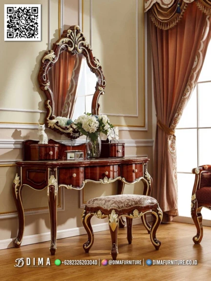 Cermin besar dengan bingkai ukir klasik membantu aktivitas berdandan jadi lebih nyaman. Laci-lacinya cukup lega untuk menyimpan perlengkapan rias, perhiasan, atau aksesoris harian agar tetap rapi. Dipadukan dengan bangku empuk, meja rias ini terasa fungsional sekaligus nyaman digunakan setiap hari.