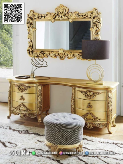 Meja rias ukiran mewah royal gold luxury bellvania hadir sebagai pilihan menarik untuk melengkapi kamar tidur dengan nuansa klasik yang terlihat berkelas. Desainnya menonjolkan detail ukiran mewah dengan sentuhan warna gold yang memberikan kesan elegan tanpa terlihat berlebihan. Model seperti ini sering dipilih untuk interior kamar dengan konsep klasik modern maupun gaya furniture mewah eropa.