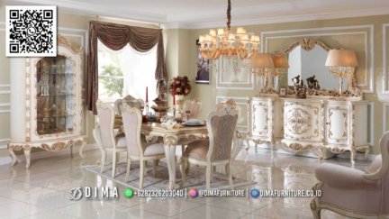 Dengan kombinasi desain klasik dan finishing mewah, set meja makan klasik elegan ini cocok untuk ruang makan mewah, hotel, maupun rumah berkonsep klasik modern.