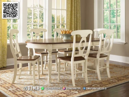 Penggunaan material kayu yang solid membuat meja makan farmhouse ini cukup kuat untuk penggunaan sehari-hari. Kursinya dibentuk dengan sandaran melengkung yang membuat posisi duduk terasa nyaman, baik untuk makan cepat maupun momen ngobrol santai bersama keluarga. Desainnya memang tidak terlalu ramai, tapi justru itulah yang membuat set ini terlihat menawan dan mudah dipadukan dengan karpet ruang makan, tirai bermotif lembut, atau lampu gantung rustic.