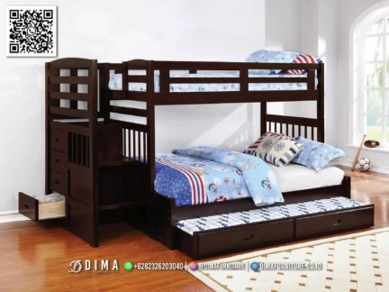 Desainnya tidak hanya berfungsi sebagai ranjang susun anak, tetapi juga dilengkapi laci penyimpanan di bagian bawah. Fitur ini membantu menyimpan mainan, selimut, atau perlengkapan tidur agar kamar tetap tertata. Tambahan extra bed pada bagian bawah juga bisa digunakan saat ada tamu atau saudara menginap.